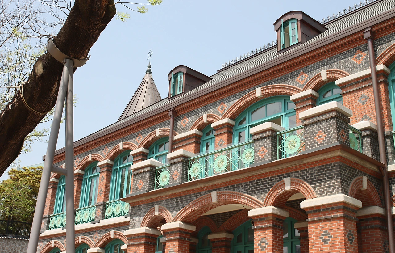 - 서양식 건축의 아치형 창과 벽돌 외관이 이국적인 분위기를 자아냅니다.
